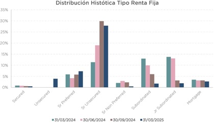 En renta fija, ésta es la evolución trimestral de la distribución por tipos de activo: