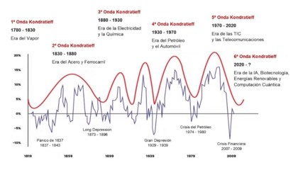La Era de la Inteligencia Artificial, la Biotecnología, las Energías Renovables y la Computación Cuántica: si bien aún es pronto para confirmarlo, podríamos estar iniciando ya la sexta onda en la que nuevas tecnologías como la inteligencia artificial o las energías renovables suponen el inicio de una nueva fase de expansión.