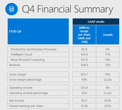Como podemos observar en la imagen Microsoft divide los ingreses en tres partes: Poductivity and Business Processes, Intelligent Cloud, More Personal Computing. Repasemos qué hay dentro de cada rama: