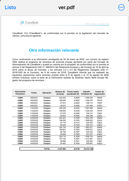 Caixabank inició su sexto programa de recompras el 16 de junio de 2025, busca reducir su capital social con un presupuesto de 500 millones de euros, pero esto no acaba en esos 500 millones vean: