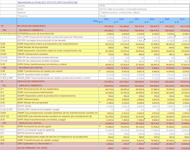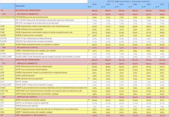 Hasta el año 2008 los Ingresos Corrientes fueron suficientes para cubrir los Gastos Corrientes, aunque la asunción de inversiones por encima de sus posibilidades ( impuestos sobre el capital y transferencias del Estado) siempre mantuvo en Déficit las cuentas públicas durante el período 2005-2010. Es decir, las CC.AA. siempre realizaron inversiones para las que no disponían de dotaciones presupuestarias adecuadas.