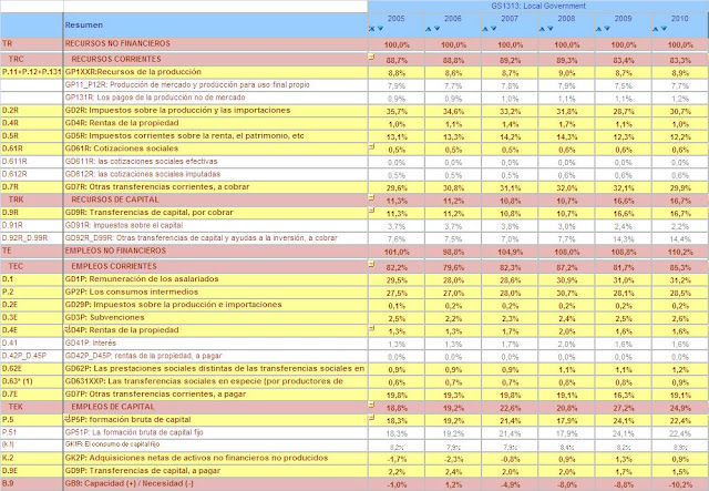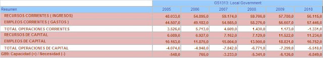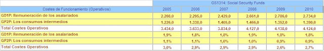 La tasa compuesta acumulada anual (%CAGR) en el período 2005-2010 de Costes de Funcionamiento creció a un ritmo del 6,7% - siendo para Remuneraciones del 7% y para Consumos del 5,9% -, mientras los Ingresos Totales sólo crecían el 1,9% y los Corrientes el 2,1%.