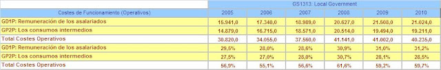 Estos Costes de Funcionamiento sobre Ingresos Totales pasan de representar en 2.005 el 57,7% hasta el 72,5% en 2.010, pasando de 74.502millones de € a 103.081 millones de €, no correspondiéndose con nuevas competencias transferidas a las CC.AA., siendo básicamente "engorde de estructuras".