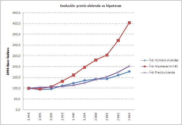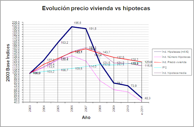 Si observamos el gráfico con base en 2003, los valores máximos de la vivienda se alcanzan en 2.006 (índice 143,1) y 2007 (índice 150,4) al igual que las hipotecas en importe constituidas ( índices 195,8 y 191,8). La diferencia entre los índices expresados de referencia anteriores era de 52,7 y 41,3 p.p.
