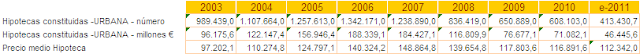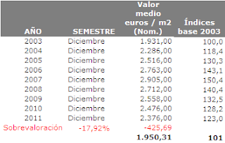 Esto nos podría llegar a hacer pensar que el precio de la vivienda está "inflado", pues a finales de 2011 el índice de valor de una vivienda fue de 123 y mantenía un diferencial con el índice de hipotecas constituidas en importe de 74,8pp.. Éste diferencial en 2007 era de 41,3pp. (1)
