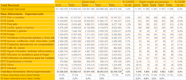 Además, la profundidad de surtido que cada operador oferte y la selección que realice de referencias lo situará con un mayor o menor grado de penetración frente a las exigencias de su demanda potencial. Hay operadores que sólo quieren tener una presencia testimonial en algunas categorías o familias de productos, pero no pueden pretender con ello satisfacer a la demanda ¿? La capacidad de Gasto en euros corrientes de nuestros clientes (la demanda potencial) la podemos obtener de la Encuesta de Presupuestos Familiares (EPF) que publica el INE anualmente. La última publicada de 2.010 expresa que el gasto medio español en base alimentaria (con la selección de agregados que adjunto posteriormente) representa un 17,2% del Total Gasto Familiar o por Persona. Esto representa unos 1.918€ / persona, habiendo disminuido respecto 2.009 un 2,2% por persona y un 1,9% en el total (la tasa anual %CAGR 06-10 fue del 0,4% en el gasto por persona y del 1,5% en el gasto total). Después de la brusca caída de 2009 (-3,7% ó -4,4%), digamos que hay cierta estabilidad en el gasto con tendencia a disminuir ligeramente, ya que para 2.011 se estiman descensos del 0,5% ó 0,6%.