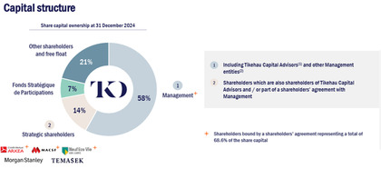 El resto del capital se reparte entre inversores estratégicos (17%) entre los que se encuentran Temasek, Morgan Stanley, MACSF y Crédit Mutuel Arkéa; el Fonds Stratégique de Participations (FSP) (7%), integrado por las siete principales aseguradoras francesas; y, por último, otros inversores institucionales y free float (21%).