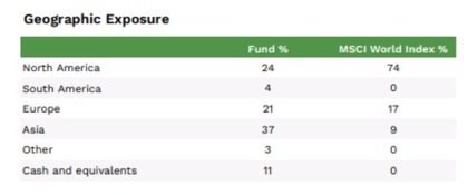 Como podemos ver en los datos, la exposición geográfica del fondo dista mucho de lo que suelen tener los fondos de renta variable global, que están muy expuestos a Estados Unidos (normalmente un 60-70%), donde sólo tiene un 24% del fondo. La región a la que tiene más exposición es Asia (37%) seguida de Estdos Unidos y Europa (21%).