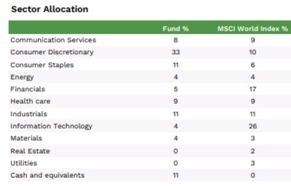 En la distribución por sectores también nos encontramos con un posicionamiento diferente: sólo un 4% del fondo está en compañías tecnológicas. El sector donde el equipo gestor encuentra más oportunidades es en el de consumo discrecional, seguido por consumo defensivo y compañías industriales. También mencionar el 11% que tienen en cash, esperando mejores oportunidades en el mercado debido a las altas valoraciones.