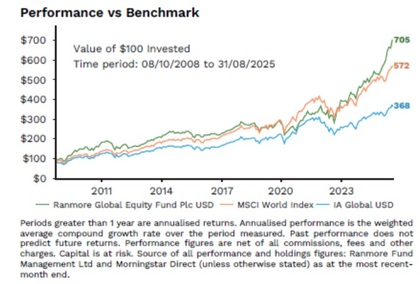 El gráfico muestra la evolución de 100 dólares invertidos desde el 8 de octubre de 2008 hasta el 31 de agosto de 2025 en el Ranmore Global Equity Fund (USD), comparado con el MSCI World Index y con la categoría IA Global USD.