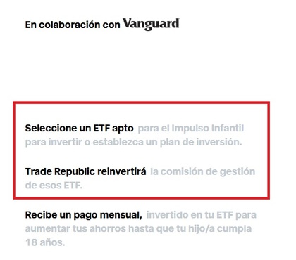Pero hay más, el neobanco alemán ha incorporado una función extra muy interesante en la cuenta infantil de Trade Republic: se compromete a reembolsar mensualmente la comisión del 0,19% de gestión que aplica a los 3 ETFs de Vanguard, mientras el menor no cumpla 18 años.