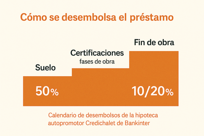 Tramo fin de obra: Una vez finalizada la construcción y con la licencia de primera ocupación concedida, Bankinter desembolsa el último tramo, equivalente aproximadamente al 10%-20% del préstamo total.