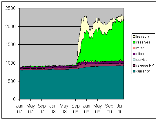 El gráfico que nos viene via Econbrowser (un blog que me encanta) es en mi opinión aterrador. Lo que tenemos en verde claro es una masa de base monetaria esperando entrar a la economía. Recordemos que la base monetaria es el dinero en su mínima expresión, una ves que 1 dolar de la base monetaria entra en la economía se transforma en muchísimos más dolares limitado sólo por la formulita del multiplicador del dinero. El potencial efecto inflacionista que tienen estas reservas es inmenso, y Bernanke se enfrenta ante una situación nunca antes vivida por ningún banco central en su historia. No sé qué tan efectivo pueda ser Bernanke en contener el potencial efecto inflacionario que tienen esas reservas en el pasivo de la reserva federal. Lo que sí tengo claro es que veremos tasas de interés muy altas en un futuro no muy lejano, ya veremos cuánto le cuesta a Benny contener la bola de nieve.