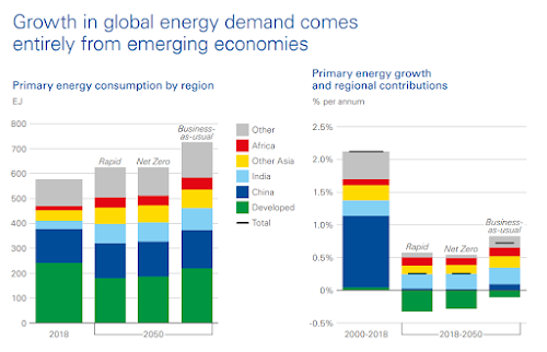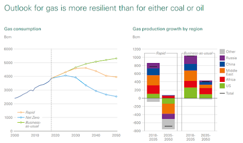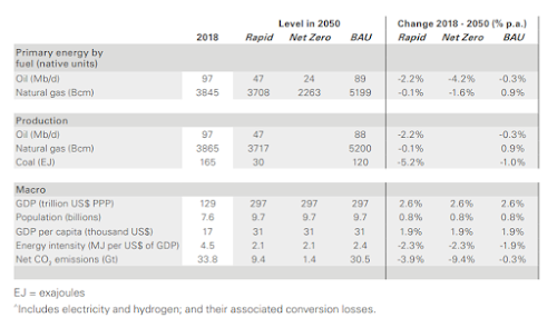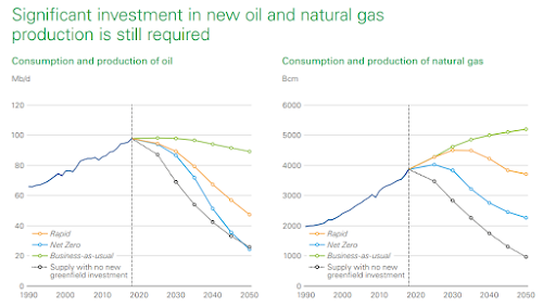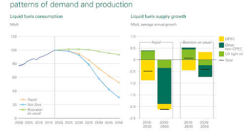 El siguiente gráfico es una declaración de intenciones en el escenario Rapid. Es el escenario central de BP y aunque la situación real sea una mezcla entre distintos escenarios, esta es la apuesta mínima que se plantea, para evitar el desastre climático. Curiosamente diré, que también encaja con las previsiones de la AIE (Agencia Internacional de la Energía) respecto a la producción de petróleo en 2050, con bajas inversiones.
