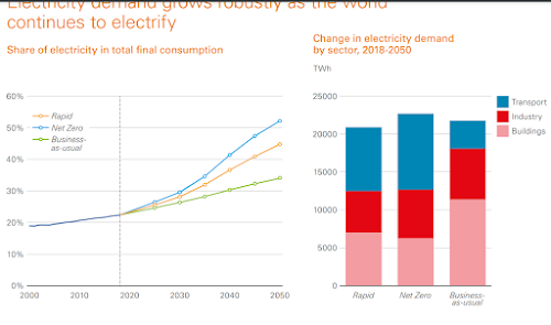 La electrificación del sistema es lo que representa el conjunto del informe. Atención al incipiente crecimiento del Hidrógeno, como combustible interesante.