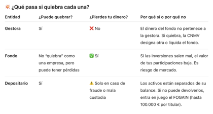 Riesgo operativo extremo → la depositaria o la gestora cometen fraude o mala gestión (muy raro). 👉 En ese caso, entraría en juego el FOGAIN, que cubre hasta 100.000 € por titular si la entidad no puede devolverte tus valores.
