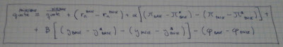 Pero mejor con un ejemplo. Vamos a imaginar que queremos saber, de acuerdo a la regla de Taylor, qué factores afectan al EUR respecto al USD (en notación tradicional, EUR, pero en notación de la fórmula que hemos usado: USD/EUR). Esto es, vamos a ver qué factores producirían una apreciación del EUR respecto al USD si seguimos la regla de Taylor: