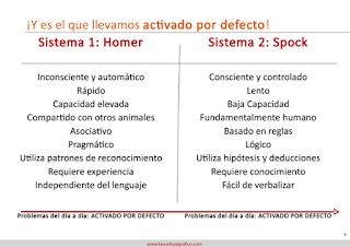 Como me aburre lo de sistema 1 y sistema 2, y ya he insistido en que no soy psicólogo (pero sí un friki como ya sabréis bien por posts como este de bolsa y cómics de superhéroes, o este con el único análisis de Porter jamás realizado a Los Vengadores) prefiero nombrar a los sistema Homer y Spock. Homer Simpson es inconsciente, es rápido, emocional y pragmático. El Señor Spock (¡y no el Doctor Spock! este es un fallo muy común, el doctor en el Enterprise es Leonard McCoy o si acaso Phlox para los seguidores de Star Trek: Enterprise ) es lento, racional, basado en la lógica.