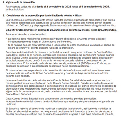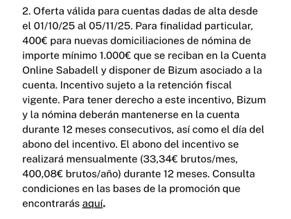 Re: Promoción Cuenta Online Sabadell. 300 €, 2,5% TAE y 3% en recibos. ¡FIN DE PROMOCIÓN! Hasta el 31/01/25