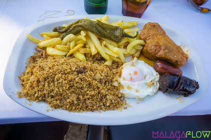 Hoy plato de los Montes de Málaga a la salud de DB. A saber: Patatas fritas, lomo de orza, huevo frito, pimientos fritos, chorizo, morcilla y migas pastoriles (opcional), que para mí no es opción. 😄😄 Para muestra...: