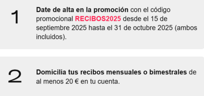 Darse de alta con el codig0 antes del 31/10/2025 y domiciliar al menos un recibo mensual o bimensual de mínimo 20€, durante los próximos 3 meses del alta. Abonan 10€ netos por recibo hasta un máximo de 60€ netos en febrero 2026. Los recibos deben mantenerse un mínimo de 12 meses desde 31/10/2025. Excluyen el haberse beneficiado alguna vez de alguna promoción de recibos con incentivo.
