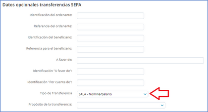 3. Desplegar Ver todos los campos opcionales y en Tipo de Transferencia seleccionar SALA - Nomina/Salario, esto es lo que indicará que la transferencia es de tipo nómina