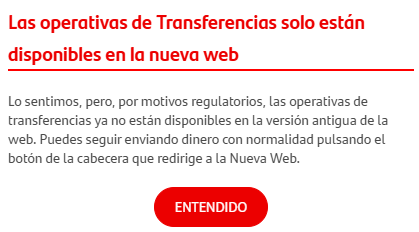 Santander nueva web: No se si alguien mas le ha pasado, pero en la cuenta de mi pareja nos llego un banner hace unos días diciendo que tenia las transferencias mejoradas. Ayer tarde al entrar en la cuenta para hacer una TR, ya no nos dejo hacer la operativa en la versión antigua. Nos aparecía este aviso: