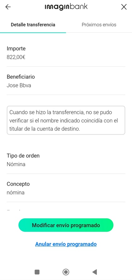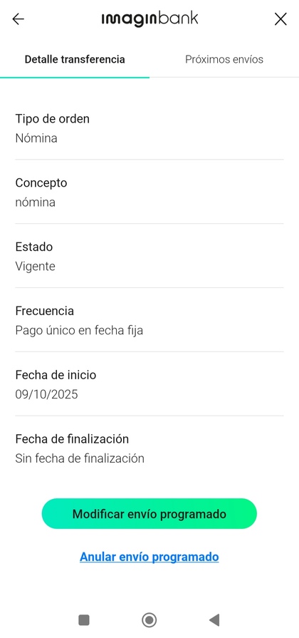 También accedí desde Imagina a los datos de transferencias programadas y me aparece cómo vigente aún y no entiendo ya que el dinero a llegado un día antes de lo que normalmente llega a VVBA