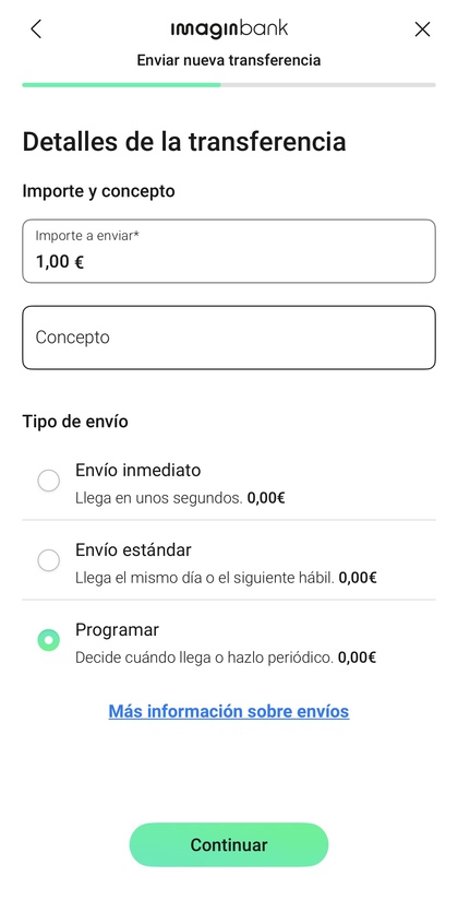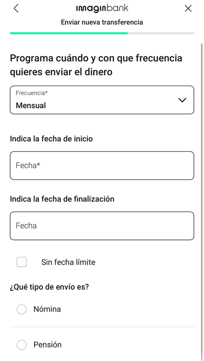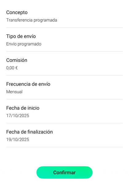 - Concepto - Tipo de envío —> Envio programado ! - Comision - Frecuencia del envío - Fecha de inicio - Fecha de finalización