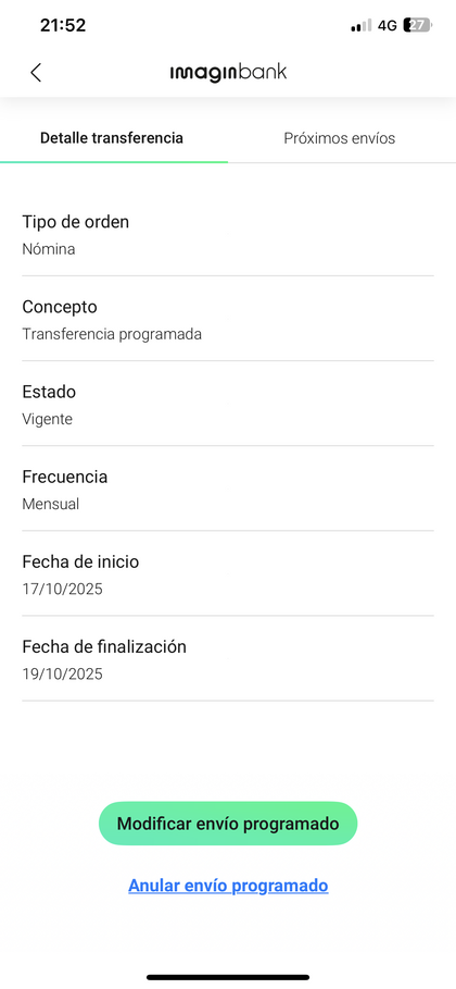 Ya solo me falta, cuando llegue esta transferencia tipo nómina a su destino, confirmar que ha llegado como tal. Si finalmente llega bien, querrá decir que siguiendo el resumen paso a paso de como lo he hecho (en el mensaje que estoy citando), las transferencias tipo nómina llegan bien. Faltaría pues confirmar por mi parte la nueva opción de elegir “Día puntual” en lugar de “mensual”, lo cual además sería hasta más cómodo.
