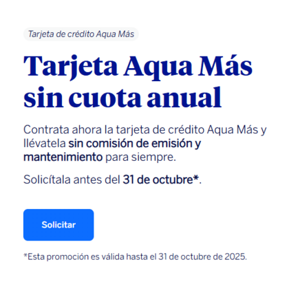 No sé si ya se ha comentado, pero hoy he entrado a la App y al ir al apartado "Tarjetas" he visto que están ofreciendo la Aqua Más sin comisiones de emisión y mantenimiento por tiempo limitado. Por si alguien no la tiene y quiere pillarla. S2!