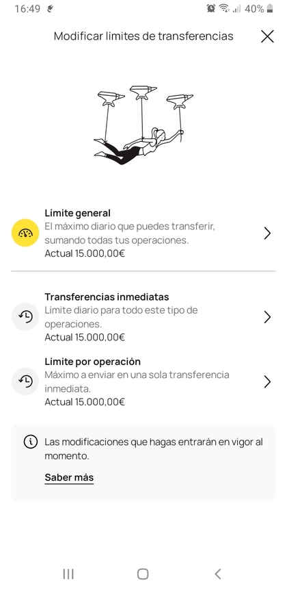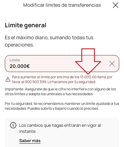 El límite siempre había sido 5.000€ que ahora lo han aumentado a 15.000€. En mi caso, es que nada más hacer el alta en B100 hace más de un año, solicité el aumento a 50.000€, lo pedí a 100.000€ pero la teleoperadora me insistió en que no era seguro, entonces le dije, vale pues 50.000€ dado que esa es la remuneración máxima.