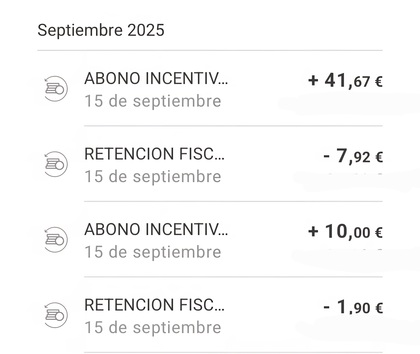#3923 Re: Cuenta nómina Cetelen 250€ brutos Ver mensaje de Dac1978 Javieros Seguir 15/09/25 17:44 Justo iba a preguntar que cuanto ingresaban? Pero veo que tengo el mismo extracto jajaSon 3 meses de recibos y 6 de cuenta Suma no? Es que es mi primer incentivo 😜 1 Responder