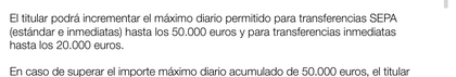 Máximo diario de 5.000€ en inmediatas y 10.000€ en ordinarias pero se pueden aumentar a 20.000€ y 30.000€ respectivamente solicitando el aumento a atención telefónica con un máximo diario de 50.000€ pues se puede hacer una inmediata al máximo y otra ordinaria al máximo, sin embargo, la autorización del extralímite sólo dura 24 horas.