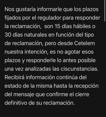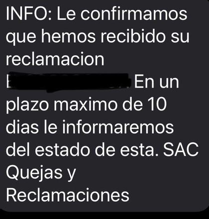 ***INFO: Le confirmamos que hemos recibido su reclamacion E-000089612. En un plazo maximo de 10 dias le informaremos del estado de esta. SAC Quejas y Reclamaciones ****