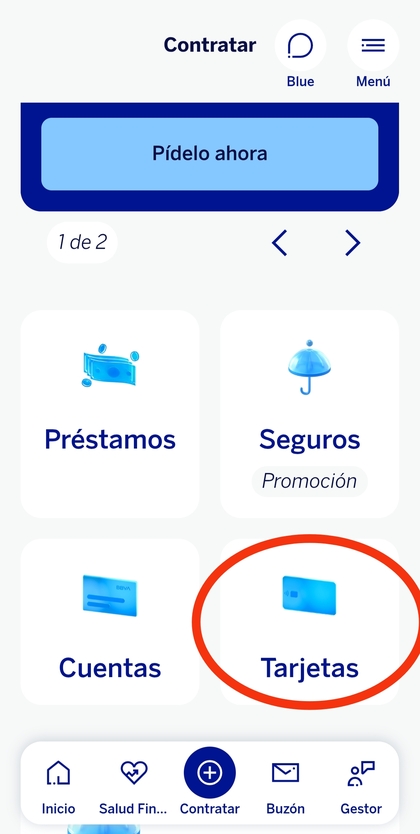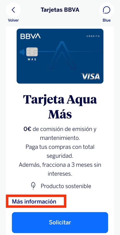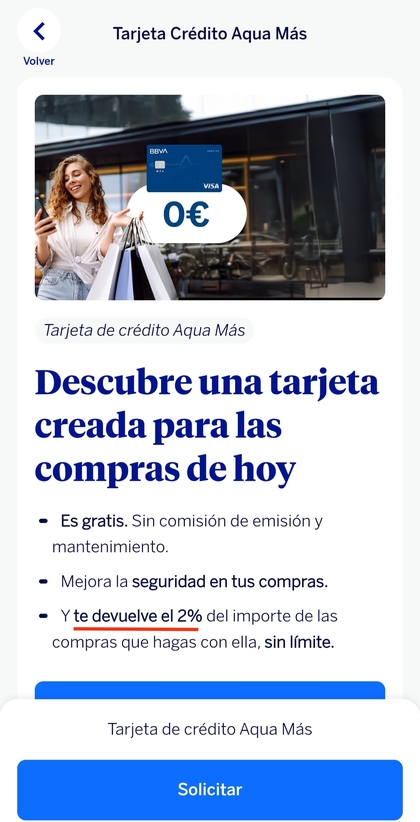 Directamente en la app, en tu área de cliente: contratar (pestaña inferior) - Tarjetas - De crédito Aqua Mas (es la primera que sale) - Más información (para ver el 2%) - Solicitar.