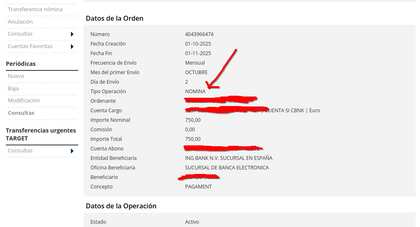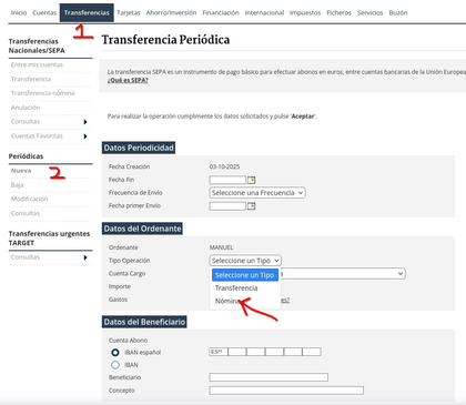 3. Configuramos la frecuencia, el destino (es un poco tedioso añadir la cuenta destino porque se tiene que hacer sección a sección del IBAN) y el tipo de operación como n0mina.