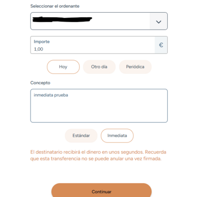A mi, cuando intentaba hacer una transferencia desde la vista operativa ampliada, se me ha cerrado la web. Al volver a abrirla me ha salido una pantalla de advertencia de que han cambiado las transferencias y ya no se pueden hacer desde la vista ampliada y que se pueden hacer inmediatas desde la vista normal, pero no es así, por ahora, o yo no he podido encontar la forma de hacerlas inmediatas.