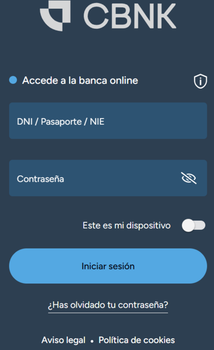 Que al pulsar, como en toda la banca web online, piden tus credenciales para entrar: Cuyo enlace directo es: https://clientes.cbnk.es/ Que será la URL que añada a los marcadores de mi navegador.