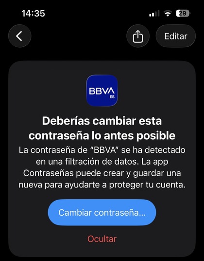 Buenas, He recibido una notificación de la app Contraseñas que indicaba que se habian filtrado mis datos de acceso de BBVA, que solo uso esa clave con ellos. Inmediatamente los he cambiado, pero no se si ha podido a afectar a alguien más. Alerta