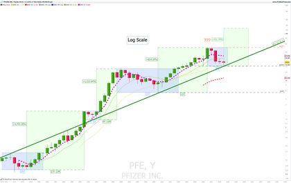 PFE velas ANUALES 55 años explicados con cajas. cajas azules, periodos de consolidación. cajas verdes, rallies multi-year y de fondo un soporte ascendente que no debe perder bajo ningún concepto.