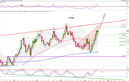 ese cierre de ayer ha dejado al precio en una situación comprometida La próxima semana se va a poner a prueba el soporte del canal y es bastante probable que lo pierda por la configuración que esta dejando en temporalidades mas amplias. PERO vayamos paso a paso. Dejo los fibos tirados.