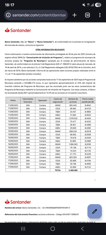 El precio de una acción de Santander suele rondar los 3 €–5 € (dependiendo del momento).