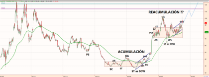 Después del largo ciclo bajista desde los últimos máximos en 120-140 euros de 2020/2021, se llegó al Selling Climax (SC) y se inició un período lateral a mediados de 2023. Podría haber sido un proceso lateral sin ningún objetivo concreto, pero empezó a acumular esos eventos climáticos modelados por Wickoff característicos de un proceso de acumulación. Por la parte fundamental, sabemos que a mediados de 2023 la empresa empezó a fabricar lurbi como si no hubiera un mañana, se iniciaron recompras de acciones (incluyendo para operación corporativa), se lanzaron patentes y ensayos de lurbi en combinaciones hasta con el Cola-Cao y se avanzaba en los ensayos de fase III. Que efectivamente se trataba de un proceso de acumulación por parte del dinero inteligente y bien informado quedó ratificado con el redout de IMforte, que inició el ciclo alcista.