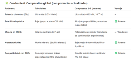 Y llegados a PHM… tenemos que tiene en desarrollo su propia división de inhibidores de microtúbulos. Por una parte el PM534 que debido a sus características parece que tiene un toxicidad reducida, y por otra parte, ha desarrollado otros inhibidores también de origen natural, en su caso de una variedad de esponjas marinas, que también tienen ultra-potencia en concentraciones picomolares y que, según los datos que citan en su patente, tienen incluso mayor potencia que esas tubulisinas de última generaciòn y también mejores condiciones en general para conformar ADC. Este es un pequeño resumen de una comparativa con IA en la que estuve trasteando: