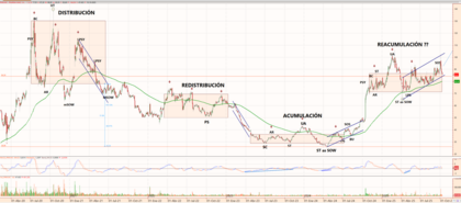 3º) En el actual rango (esperemos que de reacumulación), la cotización ha bajado a apoyar una segunda vez en la parte inferior del canal alcista, como ya hizo en el proceso de acumulación previo. Desde aquí debería armarse nuevamente. Un poco más abajo está la media de 200 también como soporte.