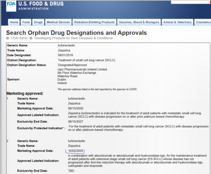 La FDA ha publicado oficialmente ya en su página web de medicamentos huérfanos la confirmación del inicio del expediente para otorgarle una nueva exclusividad de siete años sin genéricos para venta de lurbi + atezo (o atezo subcutáneo) en primera línea de cáncer de pulmón de célula pequeña (SCLC):