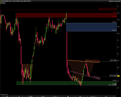 re-entrando que es gerundio ... mientras no pierda los 7,87 ( 61,80% fibo ) ... podría estar construyendo una taza con asa. A las malas completaría posición en zona 7medios.