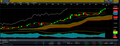 Dos de los valores con más ponderación como Iberdrola +1.5% e Inditex +2.0% lo hacen muy bien . La banca también sube bastante ( SAN ha tocado 8.88€ y ya está por encima del +100% en lo que llevamos de año 2025 , menos de 9 meses completos para doblar ) y todo ello hace que subamos más que los demás mercados .