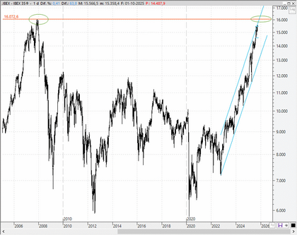 Concretamente, el Ibex 35 tiene entre ceja y ceja una vuelta a los 16.000 enteros, que son los niveles que desde hace años se han convertido en la gran meta del selectivo español y que ahora son un objetivo realista. Más aún si se confirma esta ruptura de resistencias a cierre semanal.